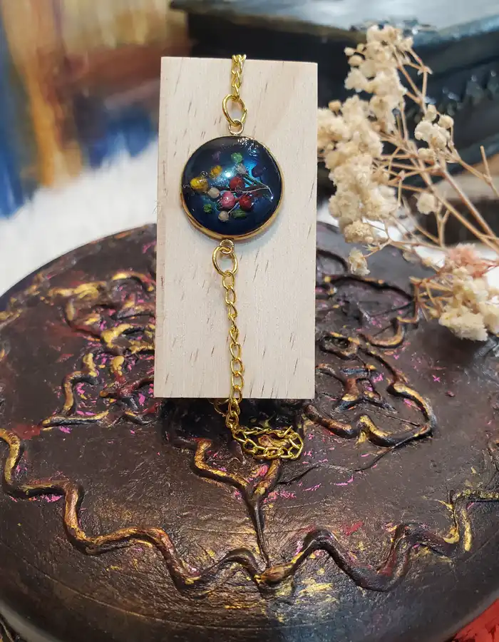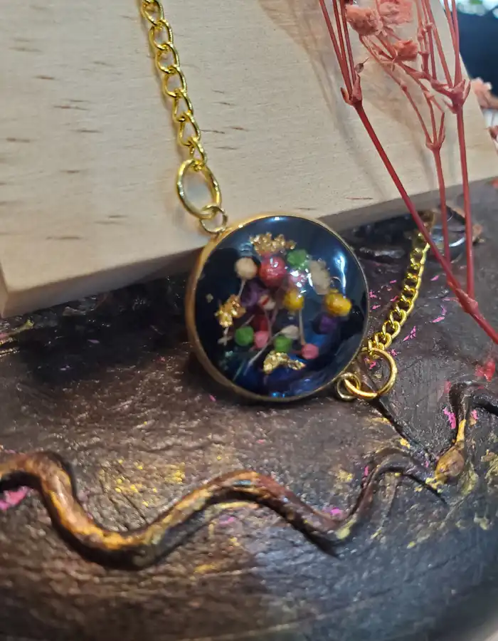 These colorful blossoms are artfully arranged on top of the black resin, showcasing a delightful array of hues that evoke the beauty of a blooming garden. Each flower is meticulously preserved under a layer of transparent resin, creating a captivating effect that highlights their intricate details. This preservation technique not only enhances the flowers’ natural beauty but also protects them, ensuring that they remain a timeless part of your jewelry collection.