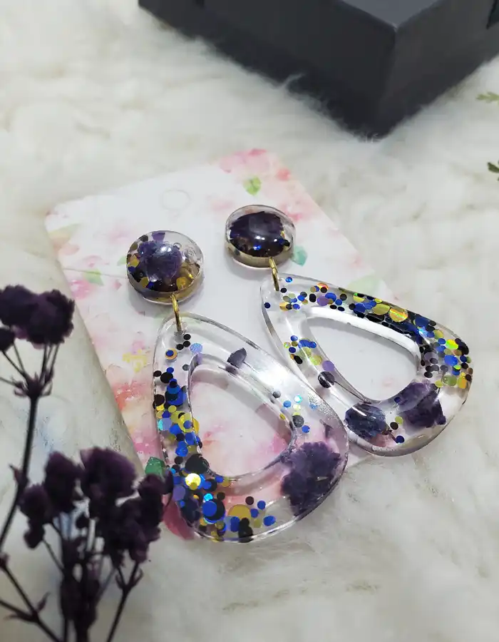 The transparent resin serves as a perfect backdrop for the vibrant infusion of multicolored and multisized glitters that dance throughout the earrings. As light catches the glitters, they create a dazzling effect, adding a touch of whimsy and sparkle to any outfit. The interplay of colors and glitters brings a lively energy to the design, making these earrings a versatile accessory for both casual and formal occasions.