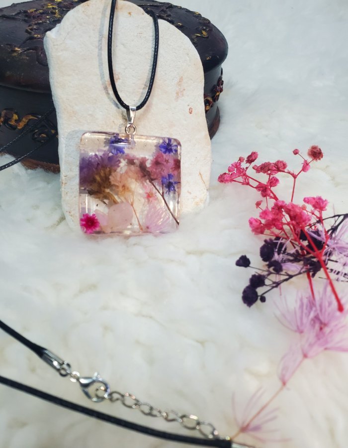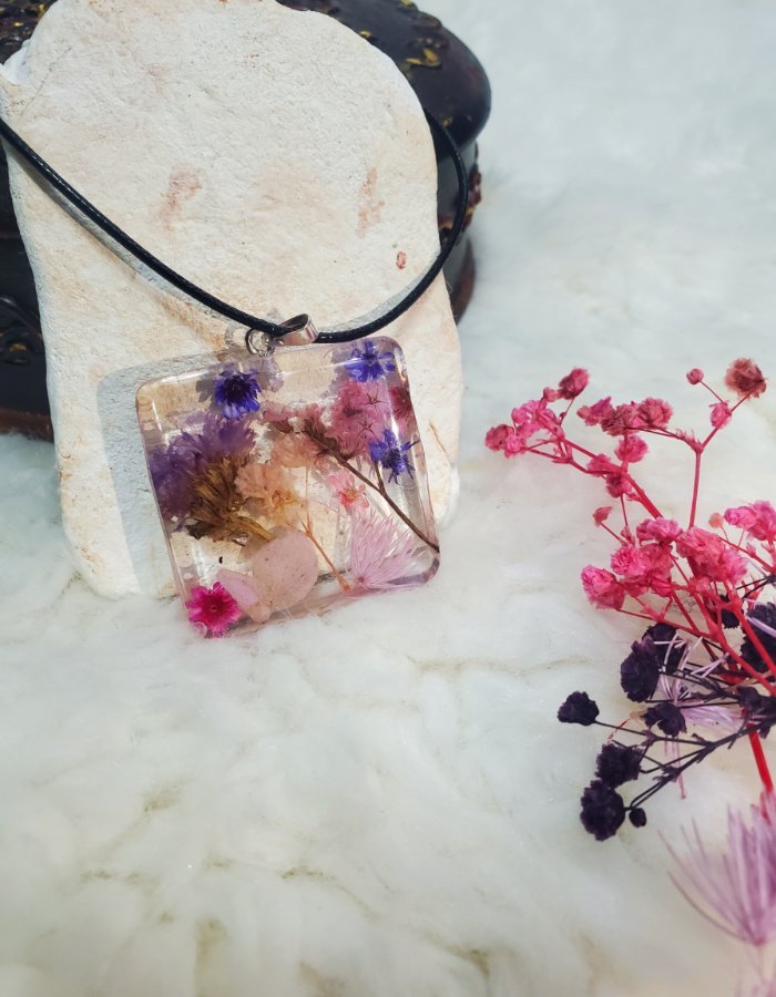 The Handcrafted Resin Pendant – Chowk-e-Gulzar is a vibrant ode to symmetry and bloom. This square-shaped pendant features a curated mix of dried flowers in purple, pink, and beige, preserved in clear resin to capture their natural beauty. Paired with a black cord and silver clasp, it offers a bold yet graceful style that blends structure with softness.