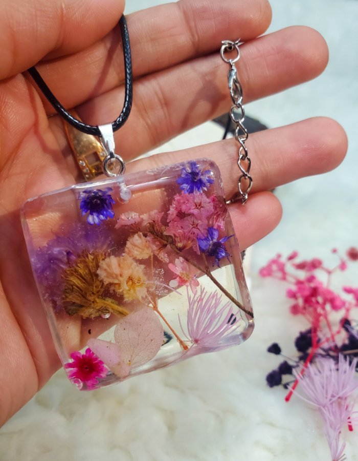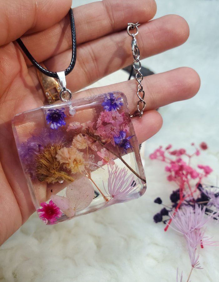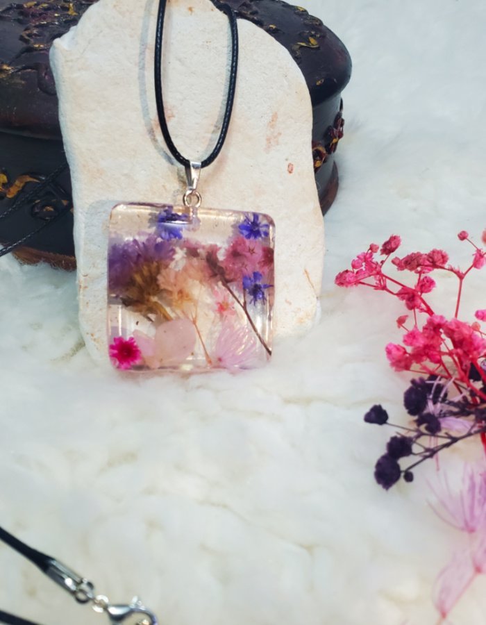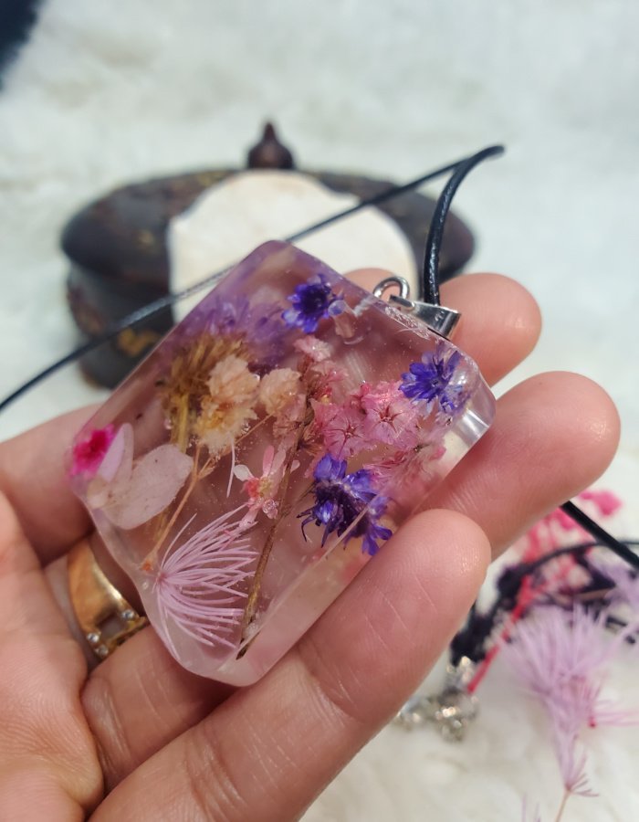 Shop now and discover the elegance of pressed flowers preserved in resin. With its garden-like arrangement and artistic square silhouette, this pendant is more than jewelry—it’s a story of nature, emotion, and timeless design.