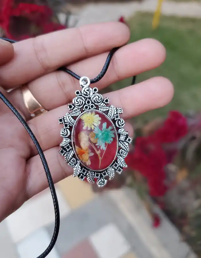 The vivid red color evokes warmth and energy, making it an eye-catching accessory that enhances any outfit.The pendant showcases an array of multicolor flowers, meticulously arranged to create a harmonious blend of hues. Each flower is carefully placed, allowing its intricate details to shine through the resin.