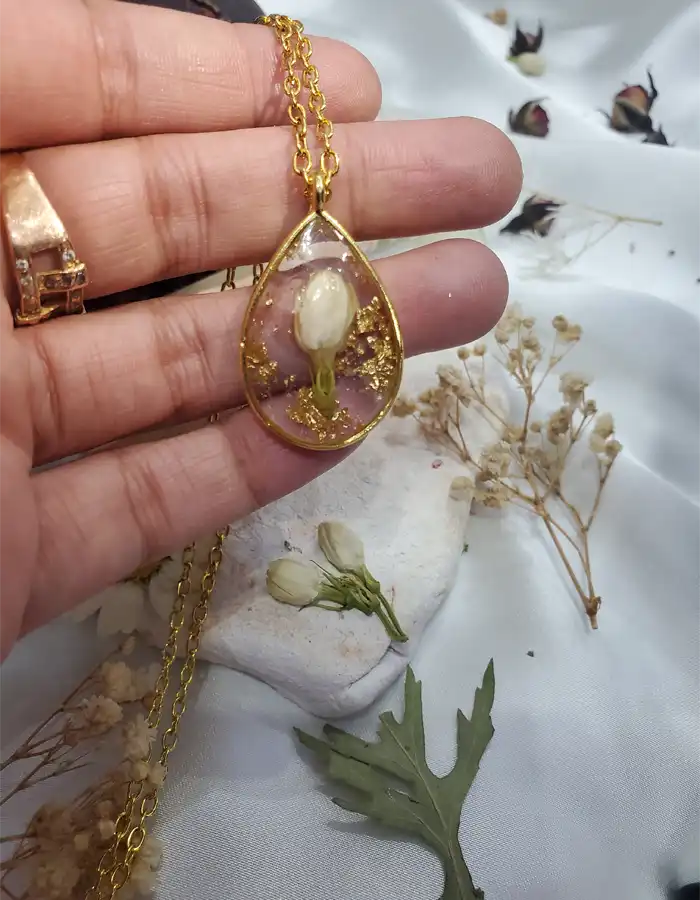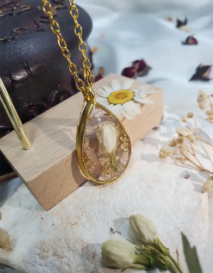 The Handmade Resin Pendant – Golden Teardrop is a graceful blend of nature and artistry. This teardrop-shaped pendant features a preserved white flower encased in clear resin, accented with shimmering gold flakes. Framed in a golden bezel and paired with a matching chain, it offers a soft yet radiant style that complements any look.