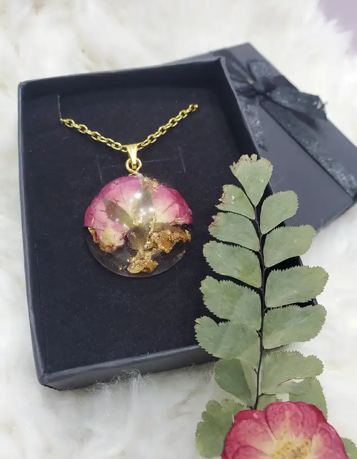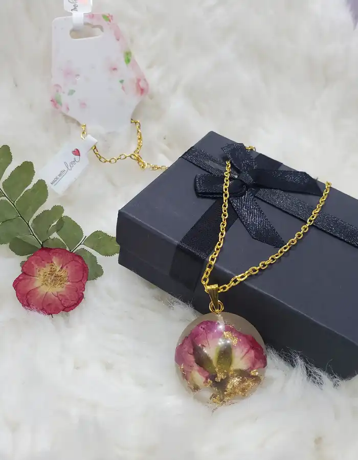 Introducing the exquisite Round Resin Pendant – Rose Promise, a stunning jewelry piece that beautifully marries nature and artistry. This charming round pendant is designed to showcase the delicate allure of a red dried and pressed half flower, expertly preserved within high-quality transparent resin. The transparent nature of the resin allows the intricate details of the flower to shine through, making it a captivating focal point for any outfit.