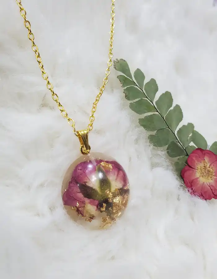 Round Floral Pendant, Dried Flower Jewelry, Gold Flake Resin Necklace, Unique Artisan Accessory