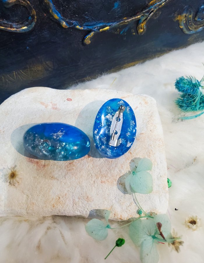 Handmade Brooch, Resin Jewelry, Oval Scarf Pin, Botanical Accessory, Nature-Inspired Jewelry, Blue Resin Brooch, Celestial Jewelry, Artisan Scarf Pin, Elegant Resin Pin