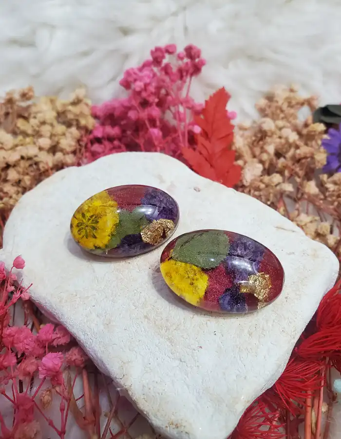 Introducing the exquisite Resin Made Scarf Pin – Verdant Echoes, a stunning accessory that beautifully captures the essence of nature. This scarf pin features an elegant oval design crafted from high-quality dark maroon resin, providing a rich and sophisticated backdrop for a vibrant arrangement of yellow flowers, purple-colored flowers, and delicate leaves. Each natural element is meticulously preserved within the resin, showcasing their intricate details and creating a captivating visual effect that brings the beauty of the outdoors to life.