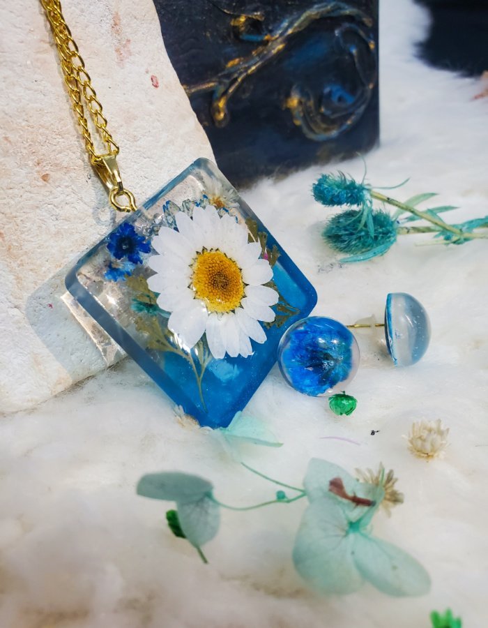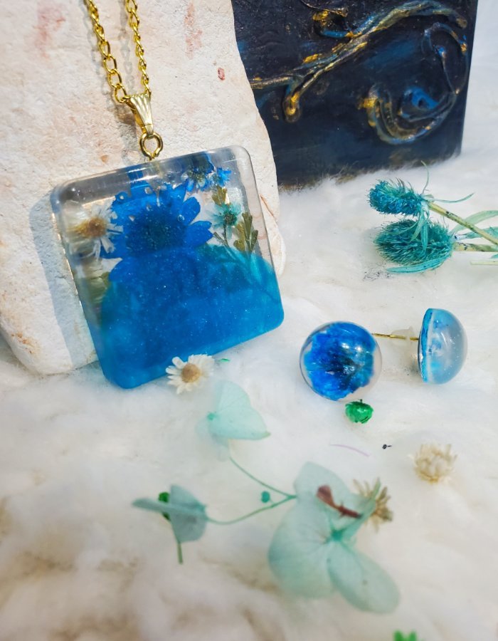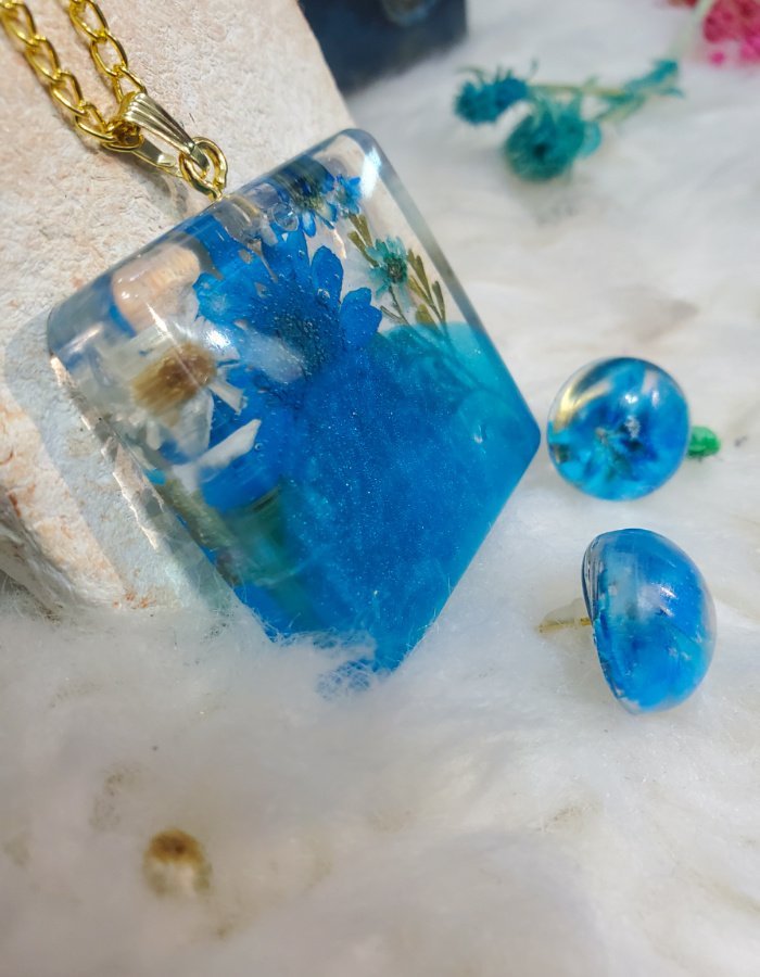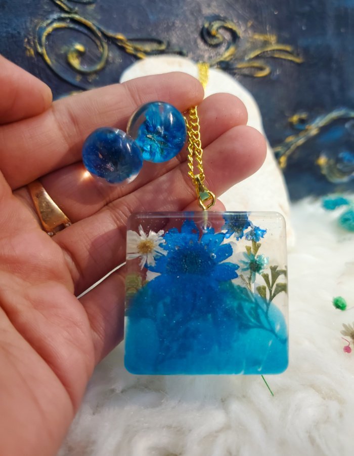 Handmade Jewelry Set, Resin Jewelry, Floral Pendant, Botanical Earrings, Nature-Inspired Jewelry, Pressed Flower Necklace, Blue Resin Jewelry, Artisan Jewelry, Dried Flower Accessories