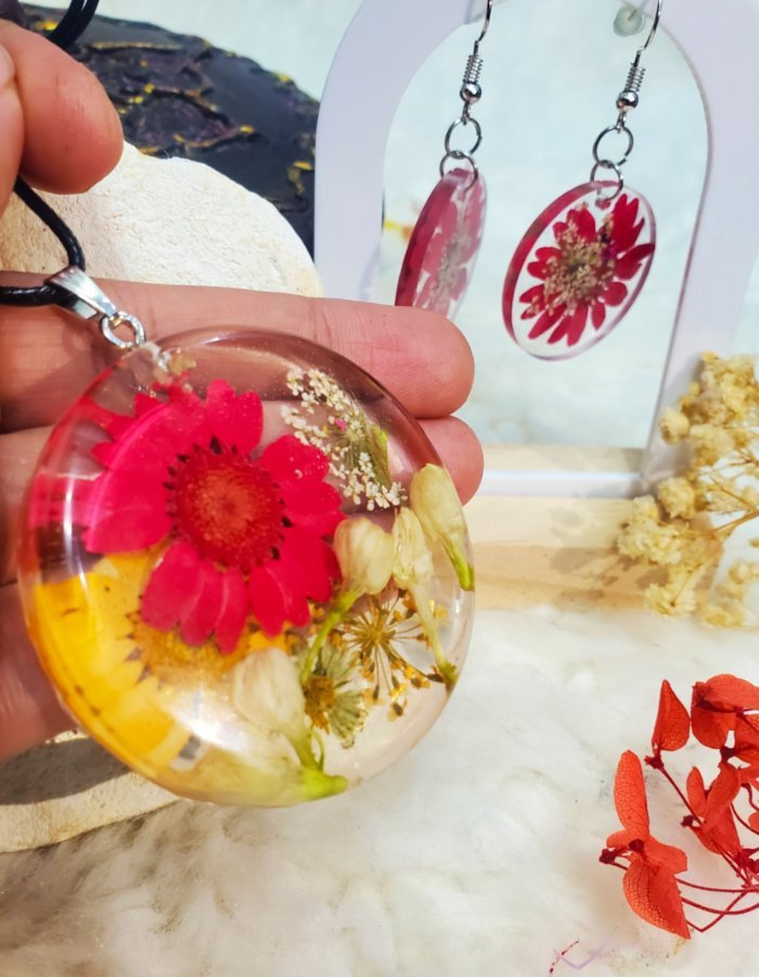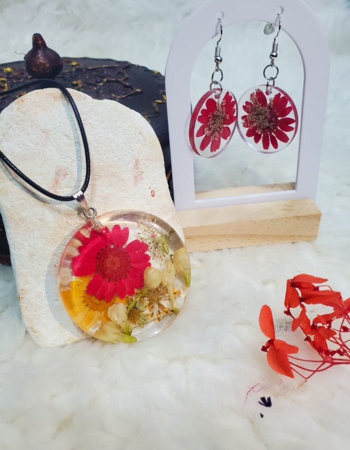 Shop now and discover the elegance of pressed flowers preserved in resin. With its round silhouette and vibrant floral details, this jewelry set is more than an accessory—it’s a story of nature, emotion, and timeless design.
