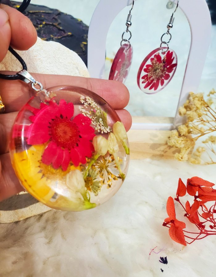 Crafted with care, the Gul-e-Daaira Set captures the warmth of botanical design and the grace of handcrafted artistry. The pendant’s circular shape and the earrings’ matching floral domes create a balanced pairing, while the resin preserves each petal’s texture and hue. The red daisy-like bloom at the center adds a bold focal point, surrounded by soft blossoms and foliage.