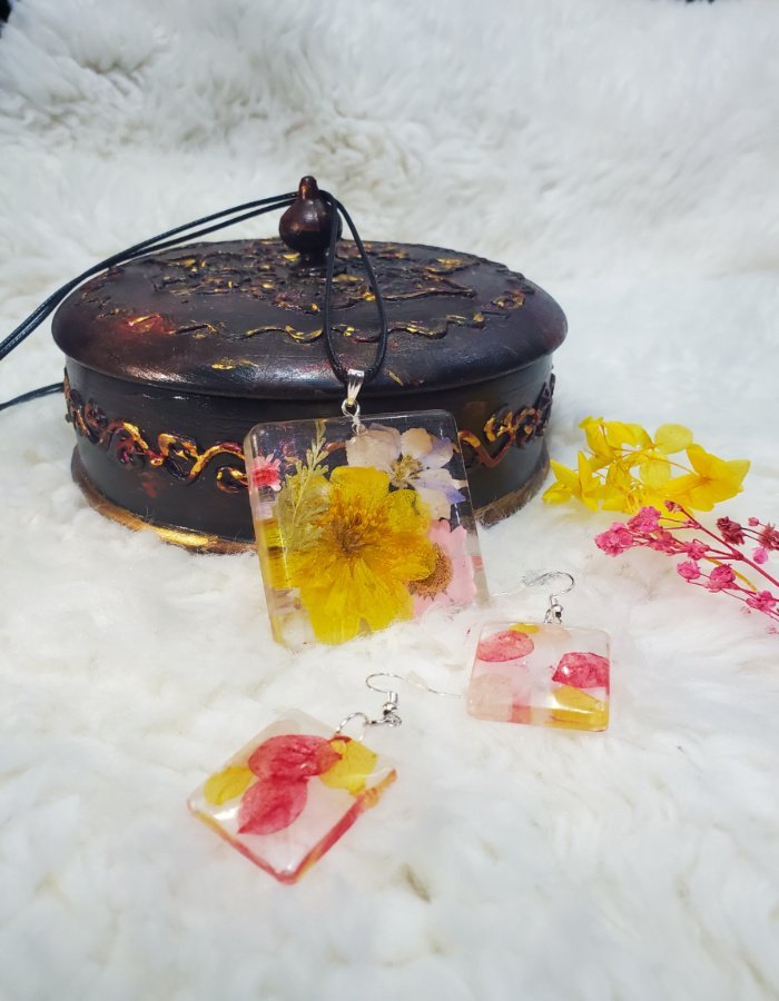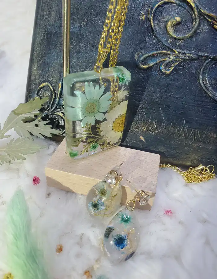 Shop now and discover the elegance of pressed flowers preserved in resin. With its golden accents and floral details, this jewelry set is more than an accessory—it’s a story of nature, emotion, and timeless design.